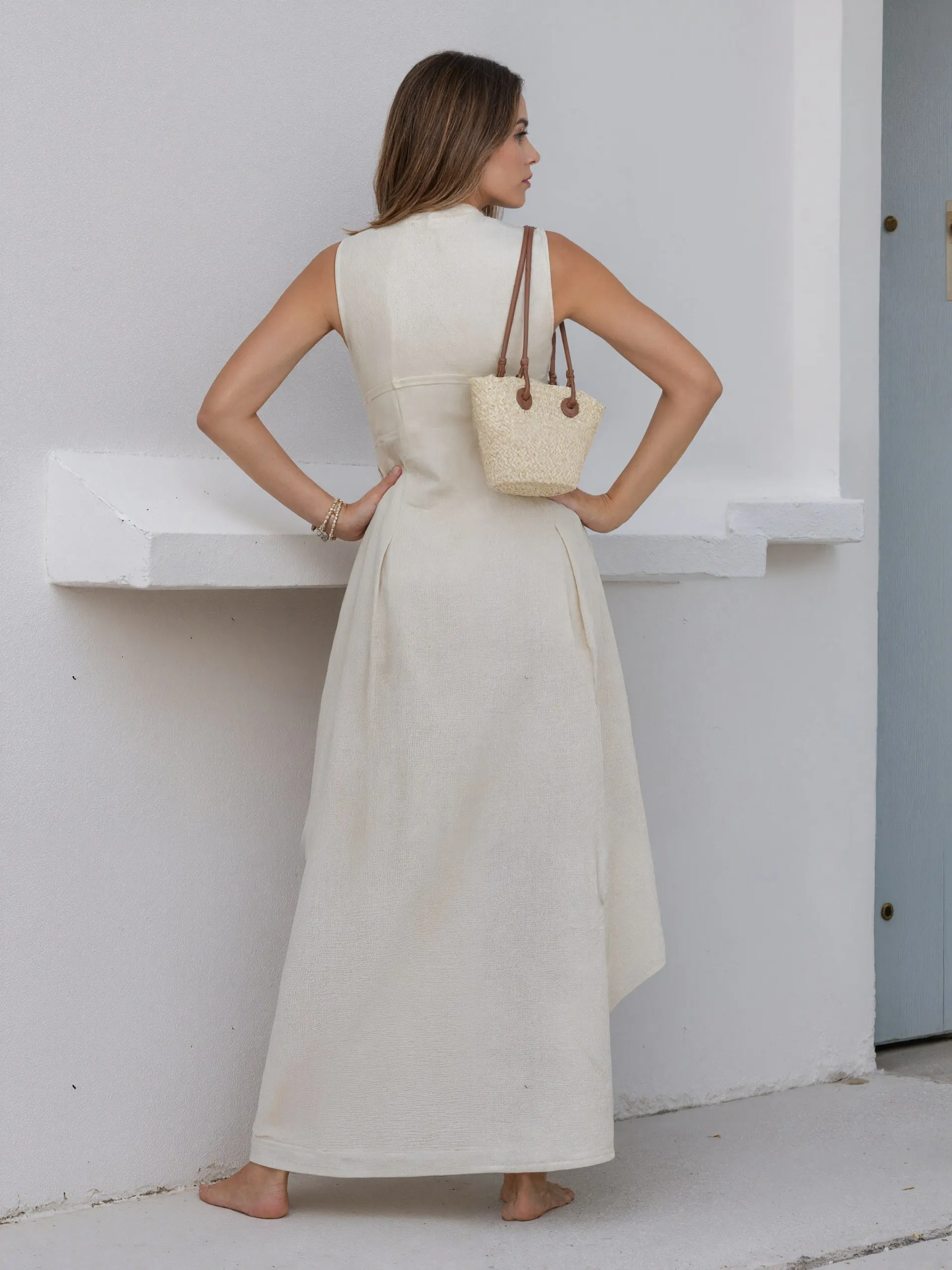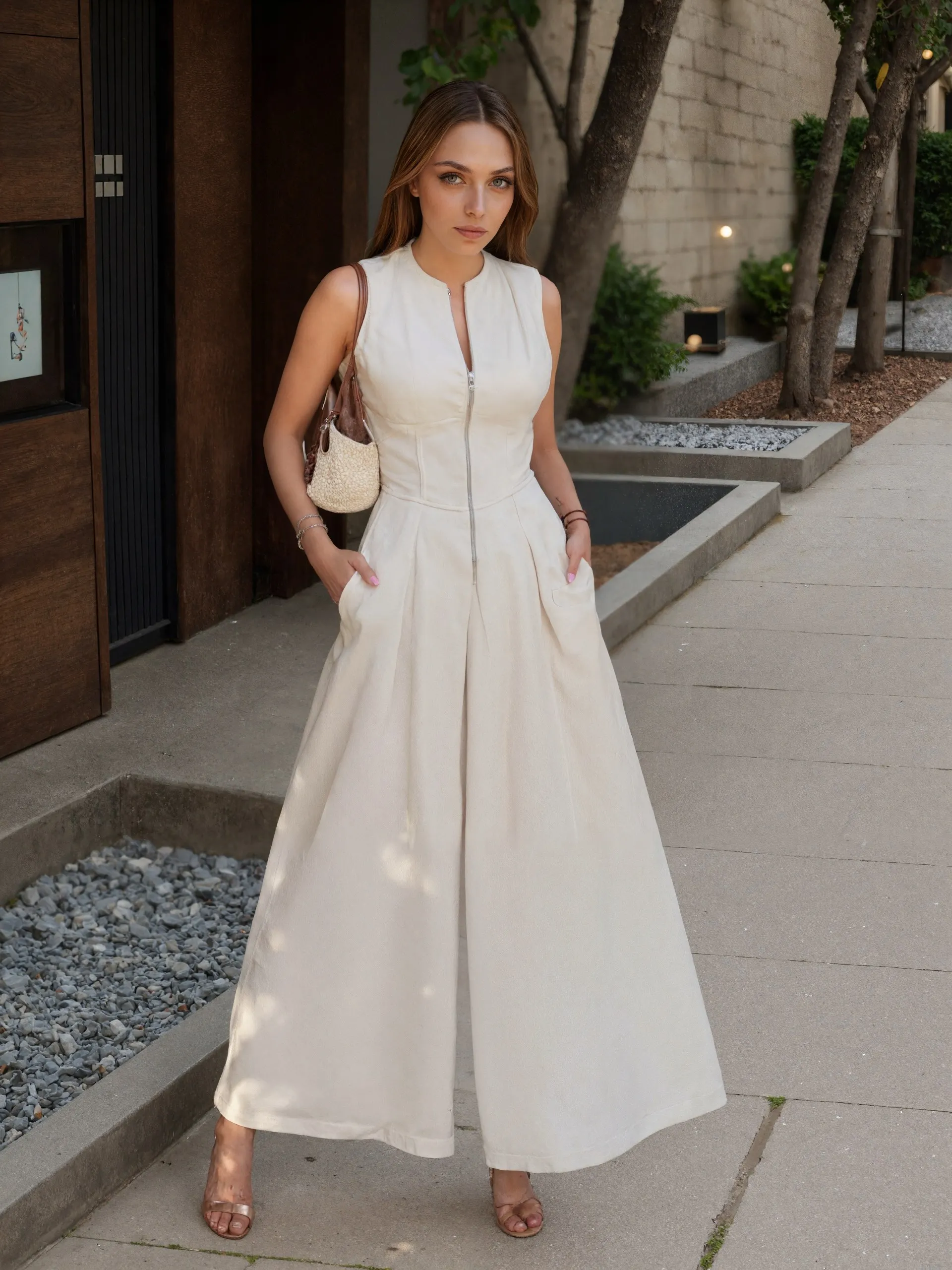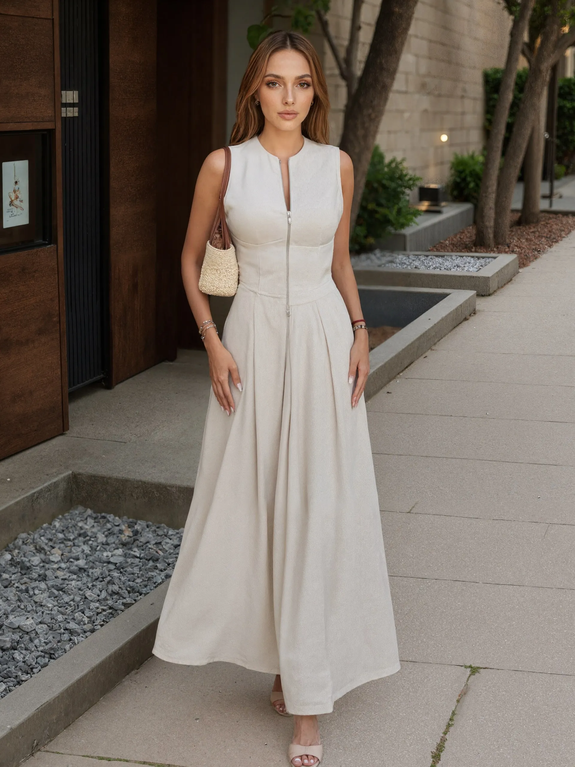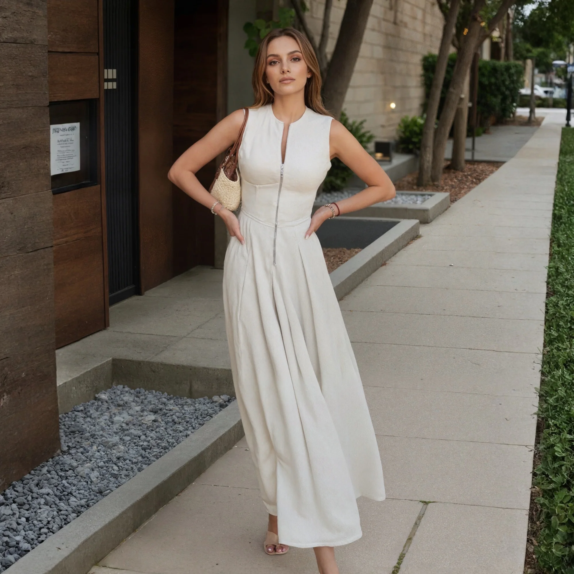 2026 Spring New Fashion French Ladies Daily Wear Zipper Waist Sleeveless Casual Long Dress White Elegant Women